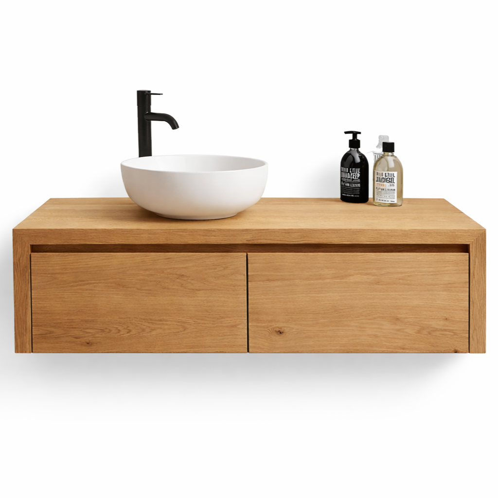 Wolf is een prachtige eiken wastafel. Eikenhout is een natuur product en dit maakt dat iedere plank en daarmee ook ieder meubel uniek is. Haal hiermee de natuur in uw badkamer.