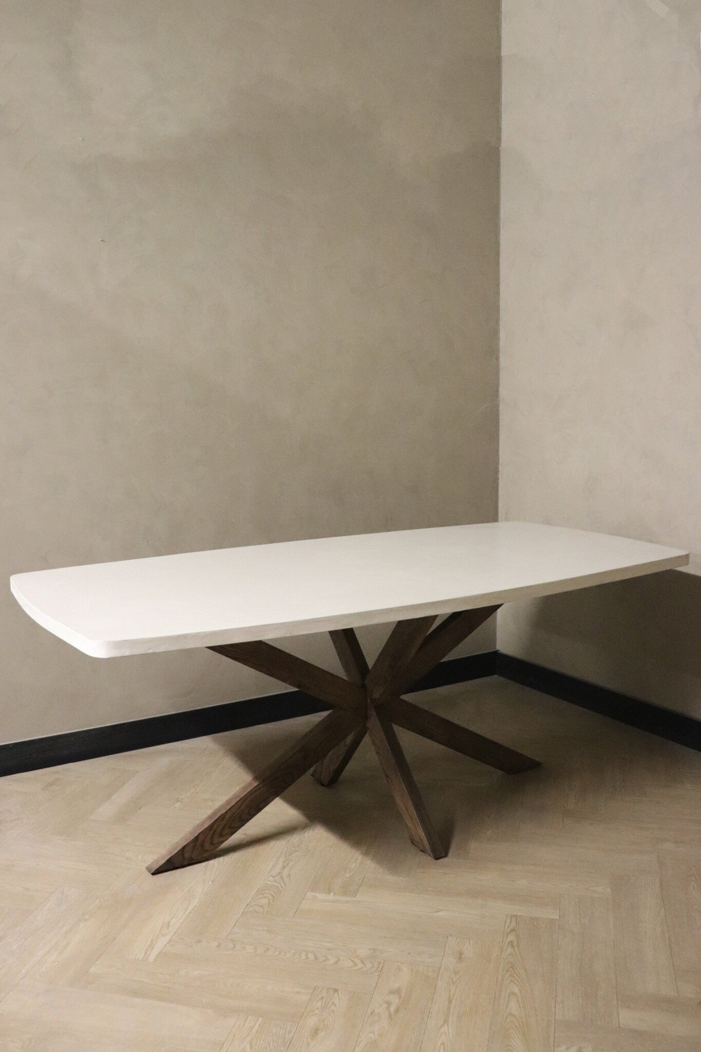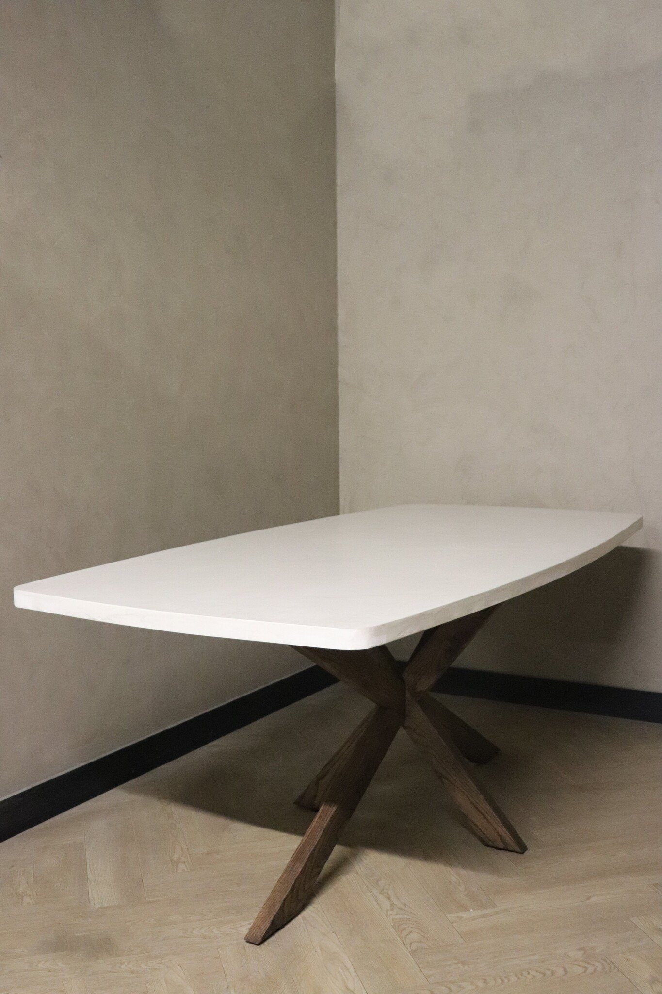 De robuuste kruispoot is vervaardigd uit massief eikenhout, wat zorgt voor stabiliteit én een warme uitstraling. De poot is verkrijgbaar in diverse kleuren en afwerkingen, zodat je de tafel volledig kunt afstemmen op jouw interieur.