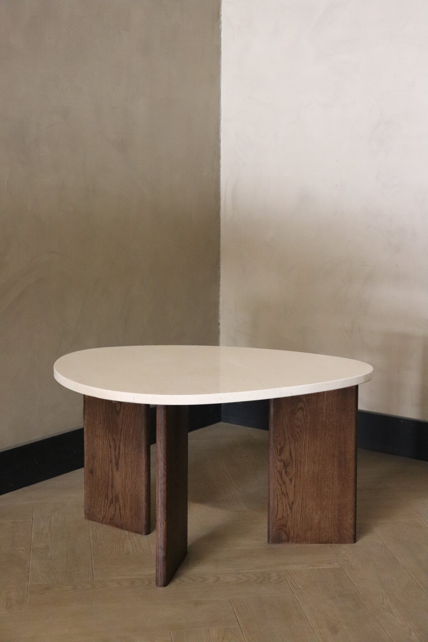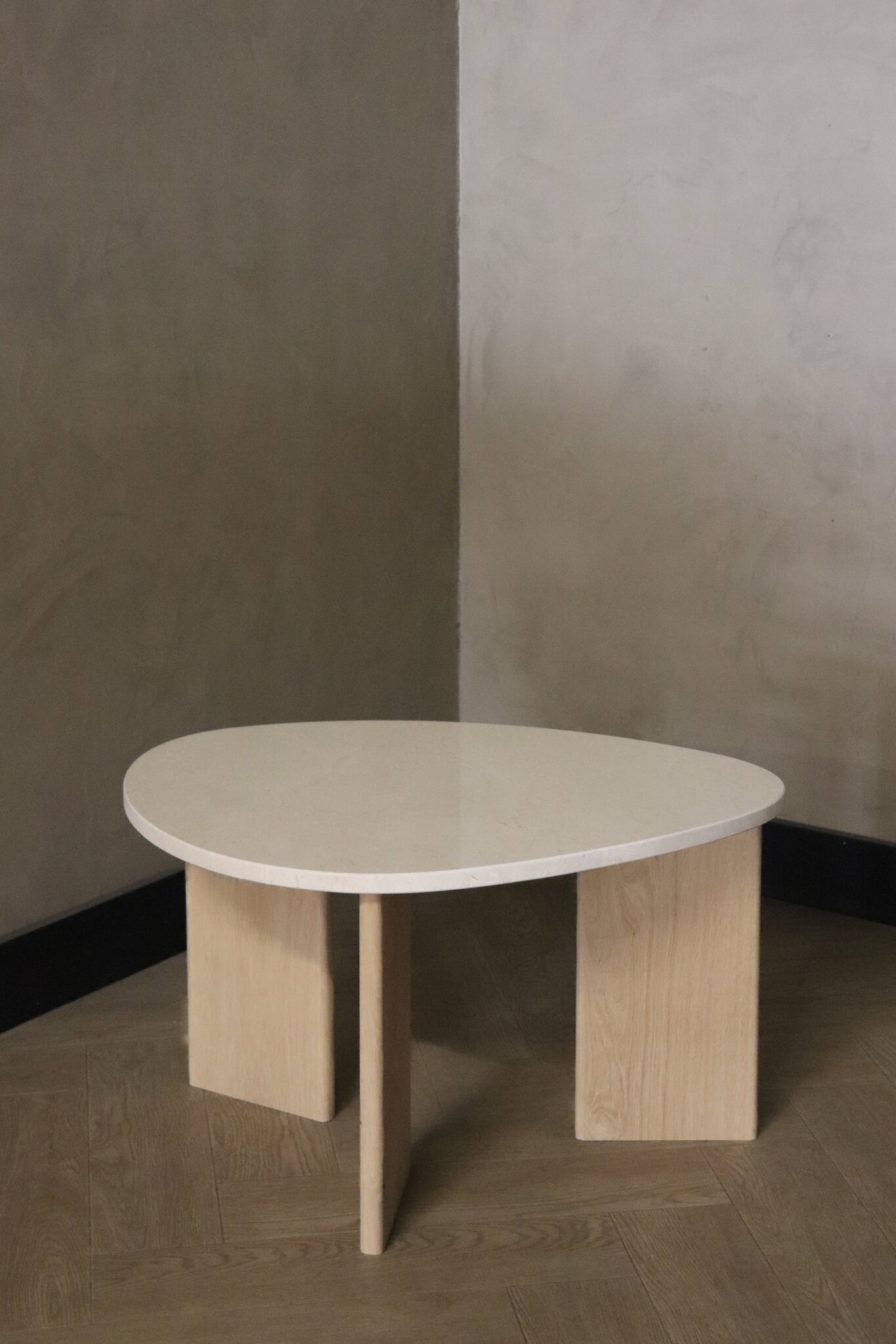 Deze organische salontafel is gemaakt Crema Marfil marmer. De prachtige rustige bladen verschillen weinig van elkaar, waardoor dit mooie soort altijd een goede keus is. Toch snappen wij dat het altijd fijn blijft om even de bladen te zien. Daarom kunt u bij Robuust Interieur uw eigen blad komen uitkiezen. Met een prachtige subtiele tekening en de natuurlijke kleur samenstelling, voegt deze salontafel stijl en klasse toe aan elke ruimte. Door de eiken poten is deze salontafel perfect geschikt voor de Japandi interieurs van nu.